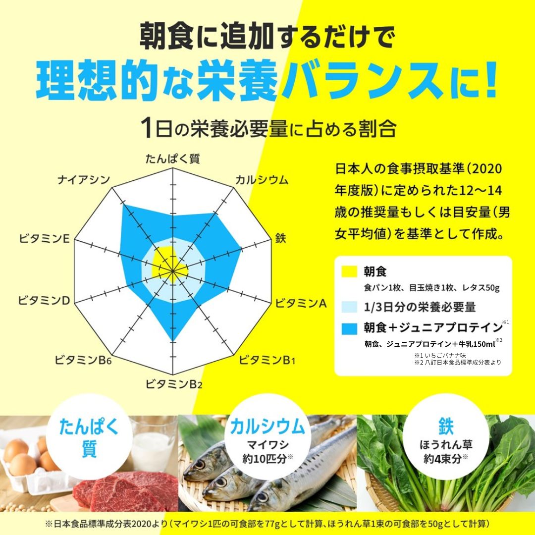 高品質原料を使用したたんぱく質だけでなく、マイワシ11匹分に相当するカルシウム620㎎※、ほうれん草4束分に相当する鉄分4.83㎎※に加え、ビタミン11種類、食物繊維などをたった1杯で成長期に必要な栄養素をフルサポートします(※いちごバナナ味1食32gあたり)。