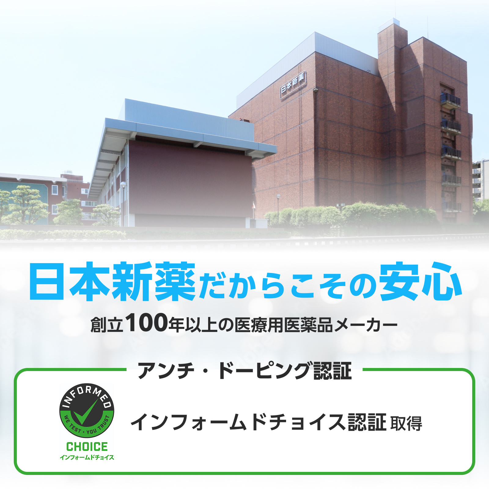 創立100年を超える製薬会社基準の品質と、トップアスリートも安心のアンチ・ドーピング認証(インフォームドチョイス)取得。