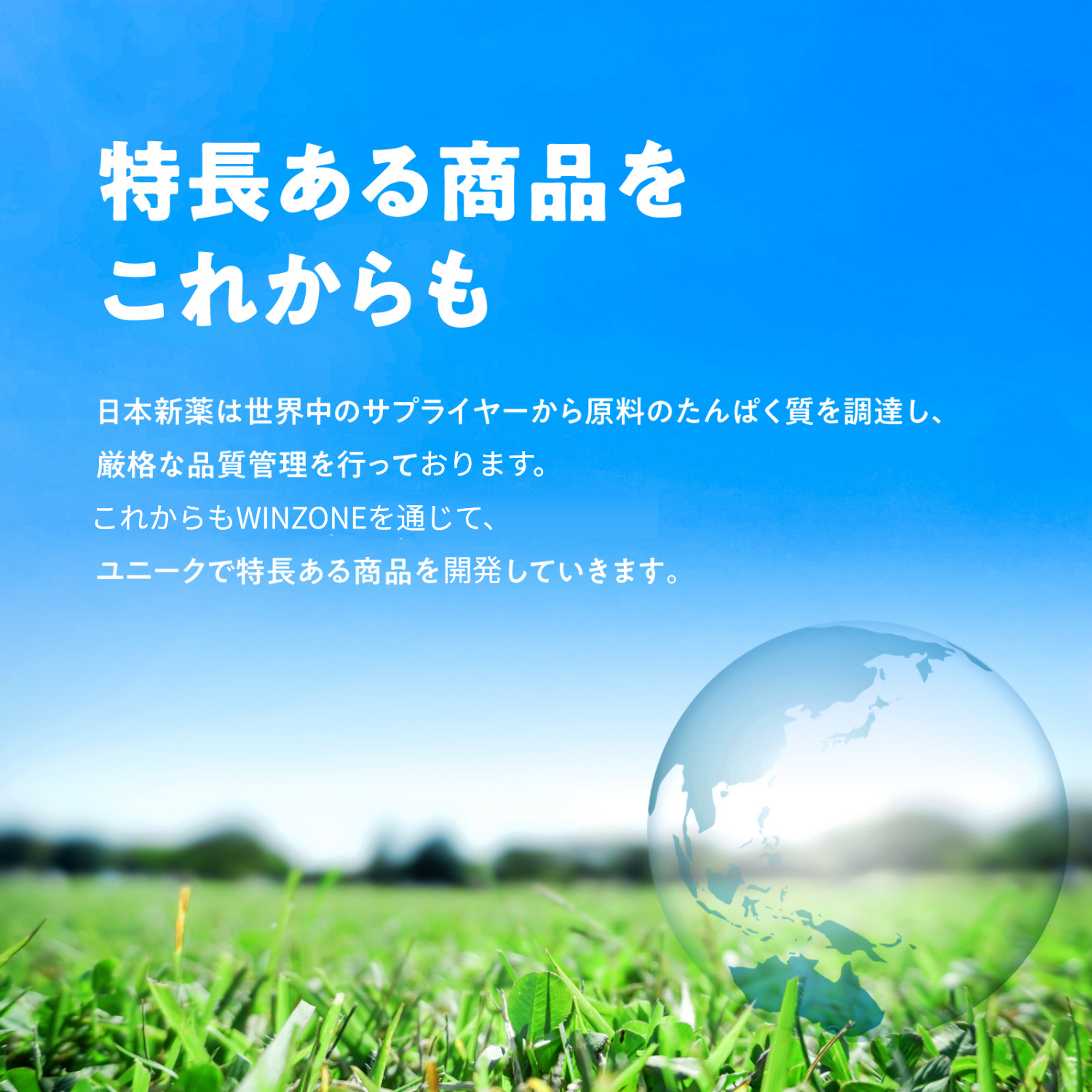 日本新薬は世界中のサプライヤーから原料のたんぱく質を調達し、厳格な品質管理を行っております。これからもWINZONEを通して、ユニークで特長ある製品を開発していきます。