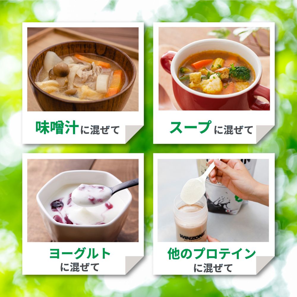 - 料理やスープに混ぜるアレンジがおすすめです。特に味噌汁やコーンポタージュ、かぼちゃスープなどのセイボリー系と相性抜群。ヨーグルトやスムージー、パンケーキ生地、他プロテインとのブレンドにも使えます。