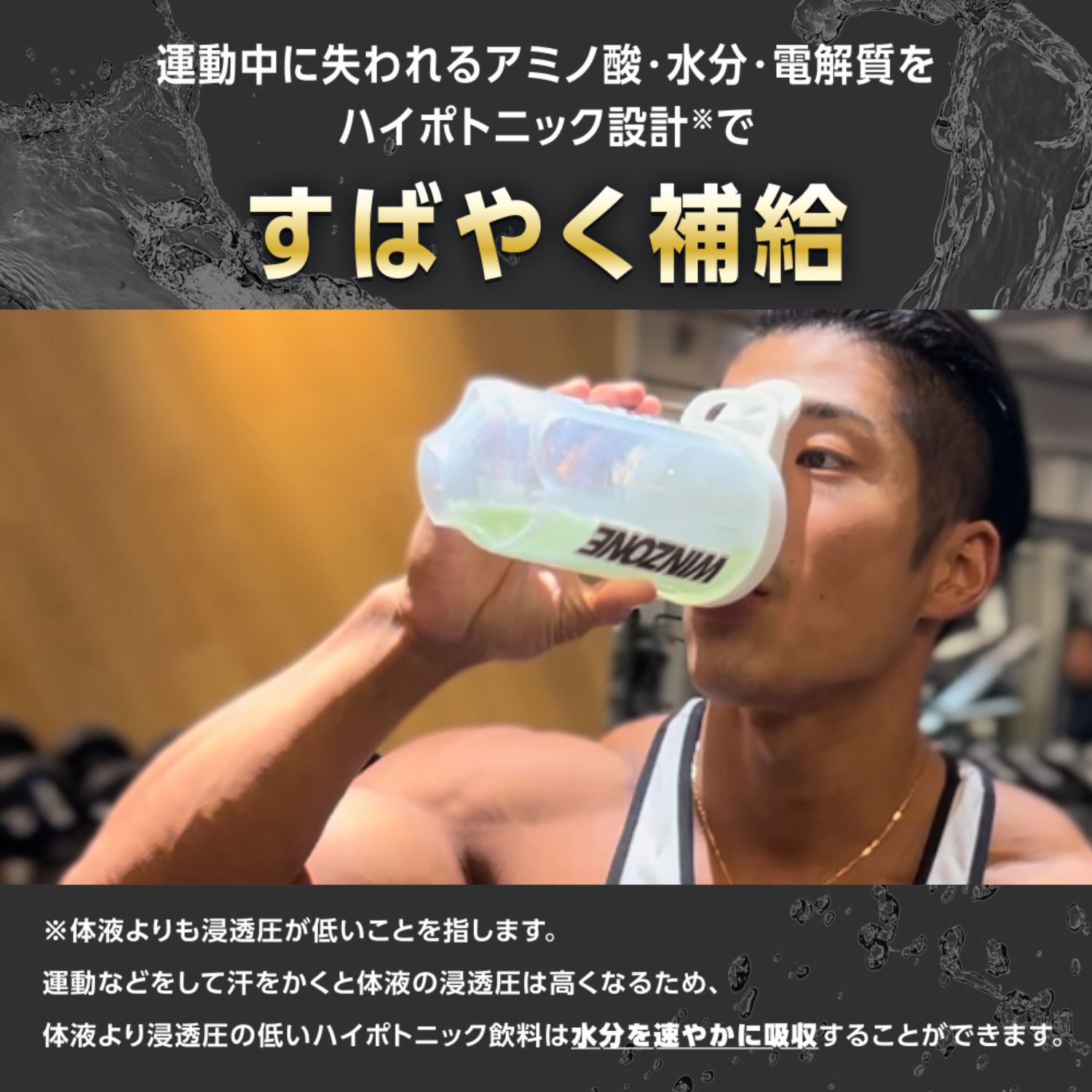 - 「カラダへの浸透」に着目した浸透型設計のハイポトニック飲料です。体液より浸透圧が低いため、特にトレーニング・運動中の摂取に適しており、運動で失われる必須アミノ酸・ミネラル(ナトリウム)・水分を「すばやく補給」したい方におすすめです。スポーツドリンク感覚でゴクゴクとお飲みいただけます。