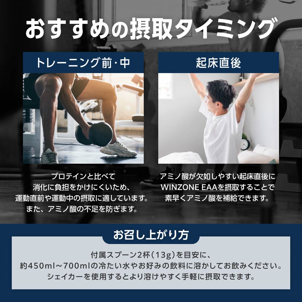 - WINZONE EAAはBCAAを含む9種類の必須アミノ酸が含まれています。そのため、BCAAの筋肉の合成促進および分解抑制をサポートする機能に加え、プロテインと同様に筋肉をつくるための原材料となることが期待されます。また、BCAA以外の必須アミノ酸がもつ様々な機能も期待されます。